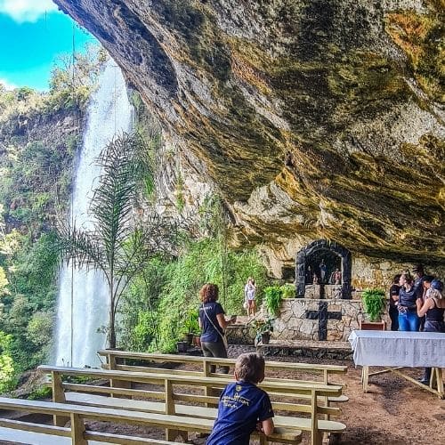 Um espetáculo da natureza, a gruta fica em baixo de uma grande cachoeira. O local é de fácil acesso com uma pequena trilha balizada para chegar até a gruta.